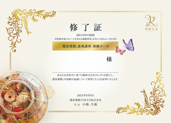 薬膳花茶®︎ソムリエ資格取得コースを修了すると、資格を取得することができます。